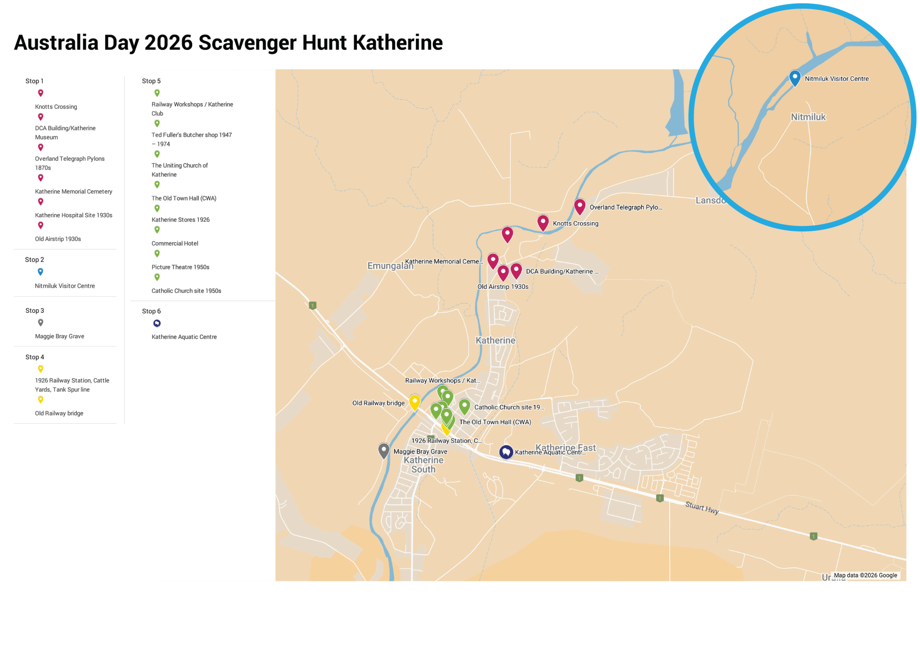 Explore Katherine’s history through our Scavenger Hunt. Each stop reveals a story, photo, or fun fact about Katherine’s 100 years.